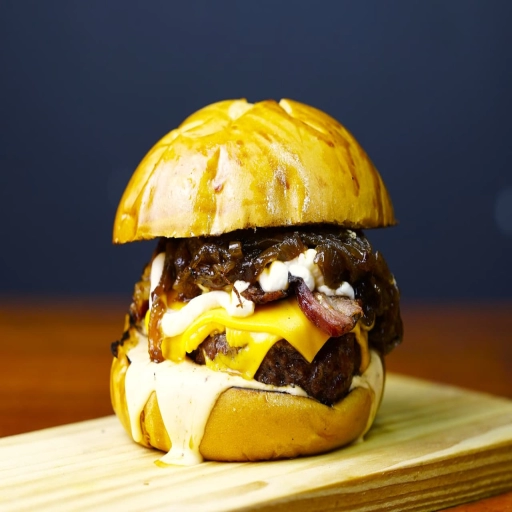 Pão macio,maionese especial da casa de bacon, 2 hambúrguer assado na brasa150g,duplo de cheddar melt
