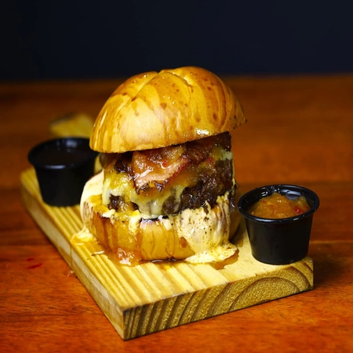 Pão artesanal ,maionese do cheff , hamburguer 150g defumado na churrasqueira de tonel abafo , bacon, cebola carameliz... Ver completo