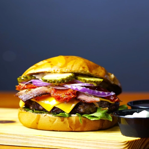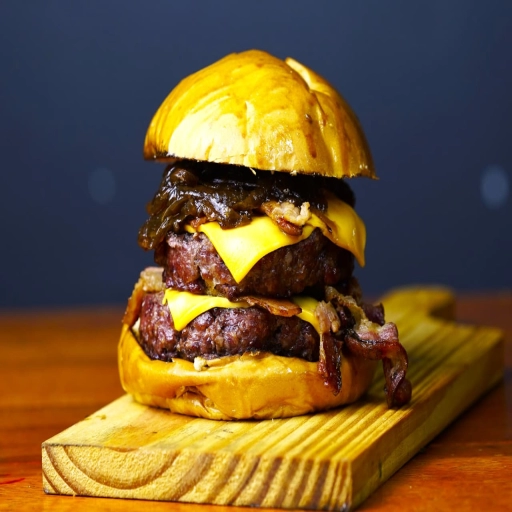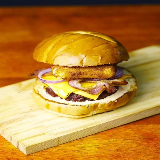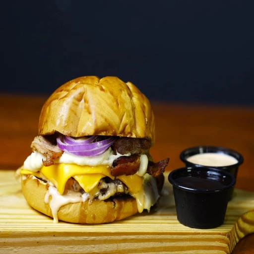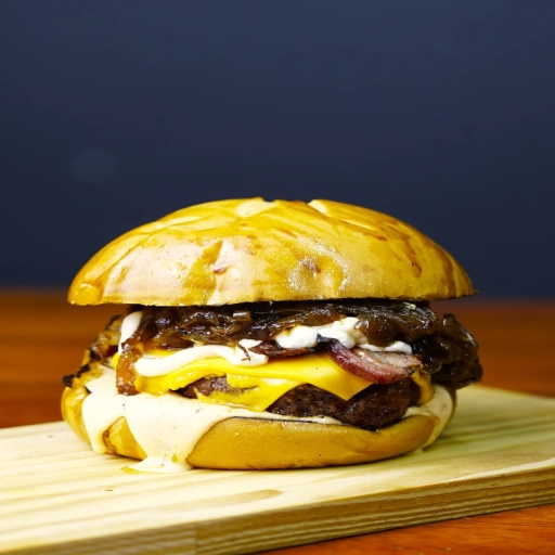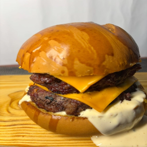 Pão macio,maionese especial da casa de bacon, 2 hambúrguer assado na brasa150g,duplo de cheddar melt