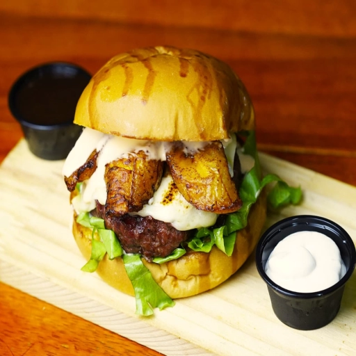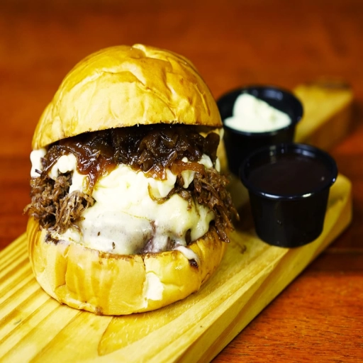 Pão artesanal ,maionese do cheff , hamburguer 150g defumado na churrasqueira de tonel abafo , bacon, cebola carameliz... Ver completo